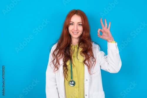 young doctor woman wearing medical uniform over blue background hold hand arm okey symbol toothy approve advising novelty news