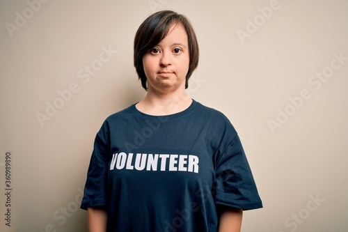 Young down syndrome volunteer woman wearing social care charity t-shirt Relaxed with serious expression on face. Simple and natural looking at the camera.