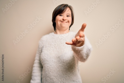 Young down syndrome woman standing over isolated background smiling friendly offering handshake as greeting and welcoming. Successful business.