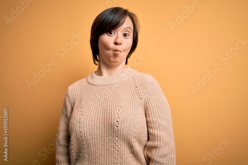 Young down syndrome woman wearing casual sweater over yellow background making fish face with lips, crazy and comical gesture. Funny expression.