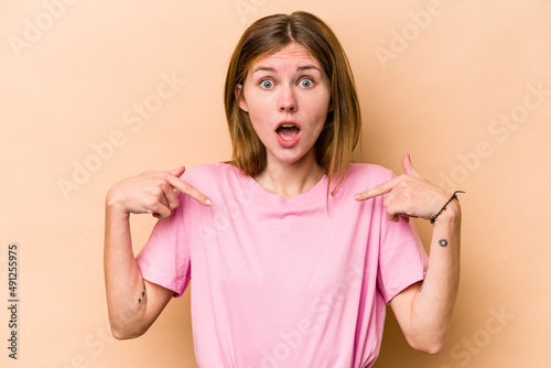 Young English woman isolated on beige background points down with fingers, positive feeling.