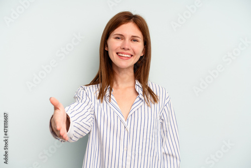 Young English woman isolated on blue background stretching hand at camera in greeting gesture.