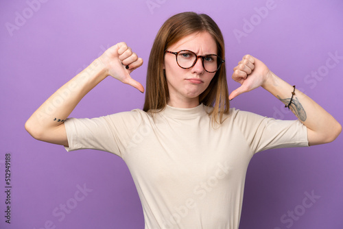 Young English woman isolated on purple background showing thumb down with two hands