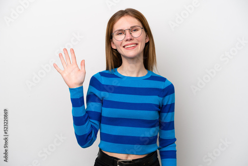 Young English woman isolated on white background saluting with hand with happy expression