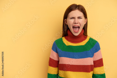 Young English woman isolated on yellow background shouting very angry, rage concept, frustrated.