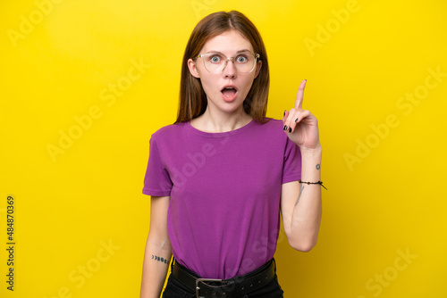 Young English woman isolated on yellow background thinking an idea pointing the finger up