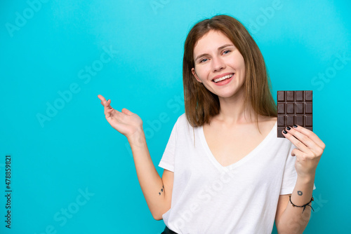 Young English woman with chocolat isolated on blue background extending hands to the side for inviting to come