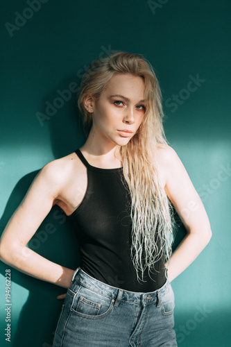 Young European attractive sexy fashion model with long blond natural hair, beautiful eyes, full lips, perfect skin is posing in jeans and shirt in studio for glamour vogue test photo shoot