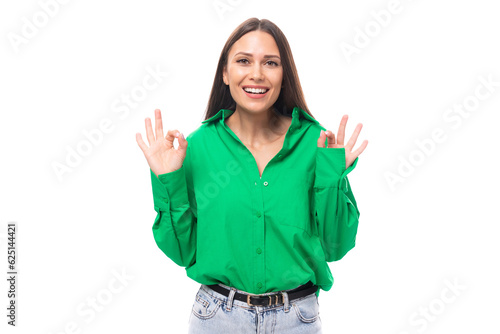 young european brunette woman with brown eyes in green blouse isolated on white background with copy space