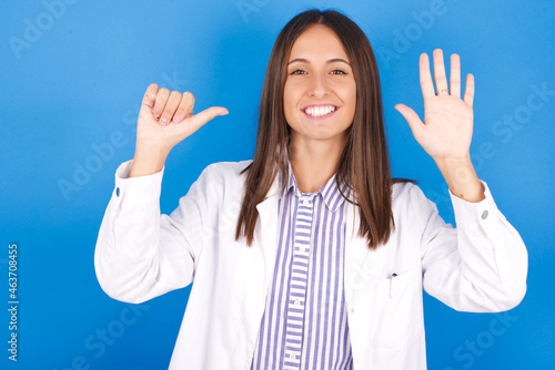 Young european doctor woman on blue background showing and pointing up with fingers number six while smiling confident and happy.
