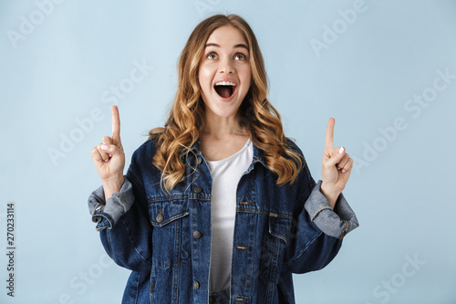Young excited pretty woman posing isolated over blue wall background pointing.