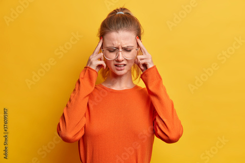 Young exhausted girl touches temples, suffers from unbearable headache, frowns, wears big optical glasses, orange jumper, stands indoor, yellow background, cannot bear pain anymore, stands unfocused