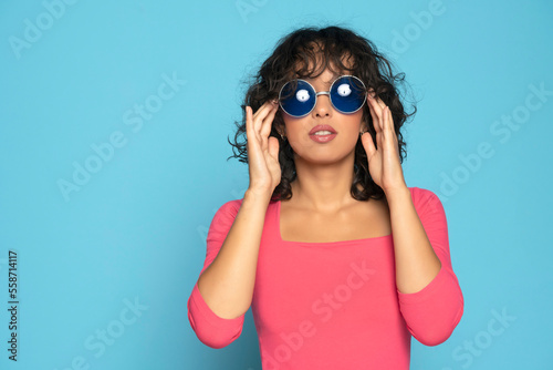 Young exotic brunette woman in pink blouse posing with a sunglasses on a blue background