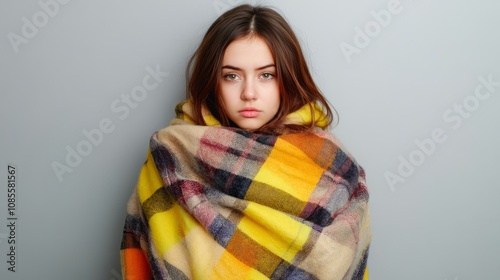 Young female patient, flu virus, feeling unwell, medical, epidemic concept, sick, unhappy girl, wrapped in a scarf, warm quilt, suffering, cold fever, high body temperature,