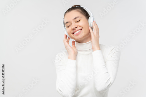 Young female relaxing to sounds of music she is listening in wireless headphones with smile, isolated on gray background