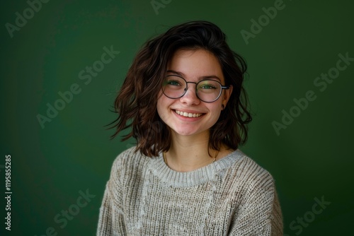 Young female student in pullover and shirt, wearing big round spectacles, smiling at camera