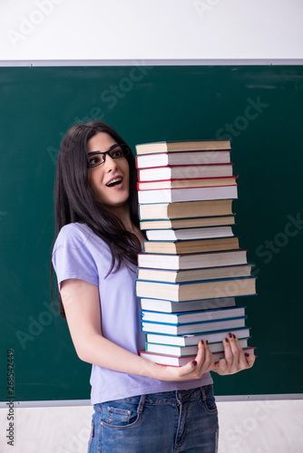 Young female teacher student in front of green board