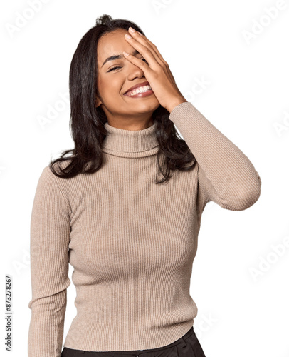 Young filipino woman laughing happy, carefree, natural emotion.