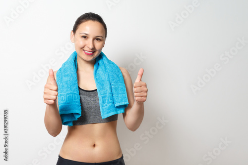 Young fitness woman with towel on shoulders showing thumb up gesture