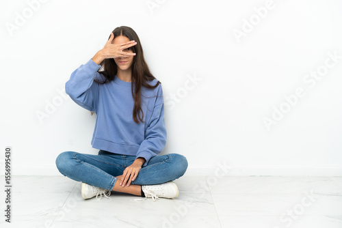 Young French girl sitting on the floor covering eyes by hands and smiling