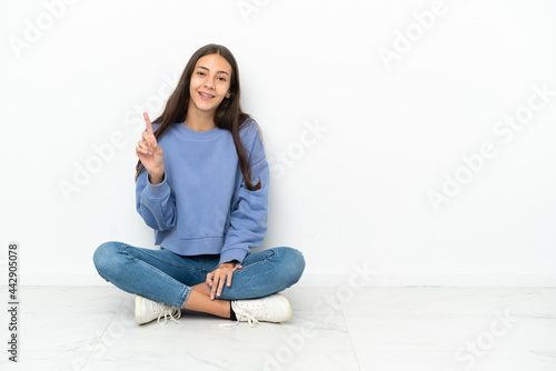 Young French girl sitting on the floor showing and lifting a finger in sign of the best