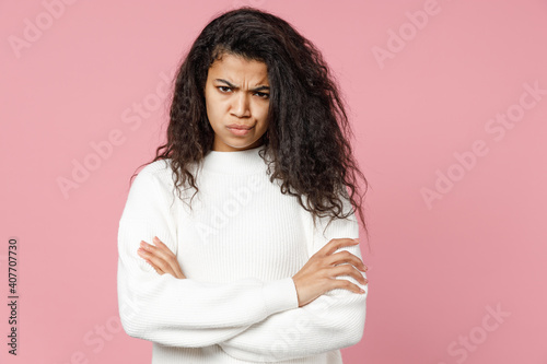 Young frowning displeased african american woman 20s curly hair in white knitted sweater look camera hold hands crossed folded isolated on pastel pink background studio portrait. Lifestyle concept.