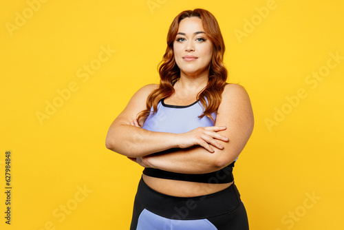 Young fun chubby overweight plus size big fat fit woman wear blue top warm up training hold hands crossde folded look camera isolated on plain yellow background studio home gym. Workout sport concept.
