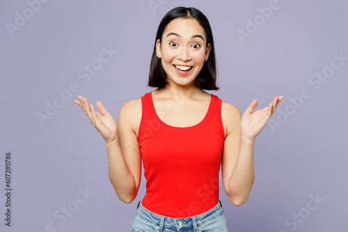 Young fun surprised shocked excited woman of Asian ethnicity she wear casual clothes red tank shirt spead hands look camera isolated on plain pastel light purple background studio. Lifestyle concept.