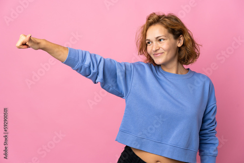 Young Georgian woman isolated on pink background giving a thumbs up gesture