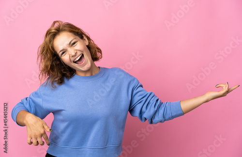 Young Georgian woman isolated on pink background making guitar gesture