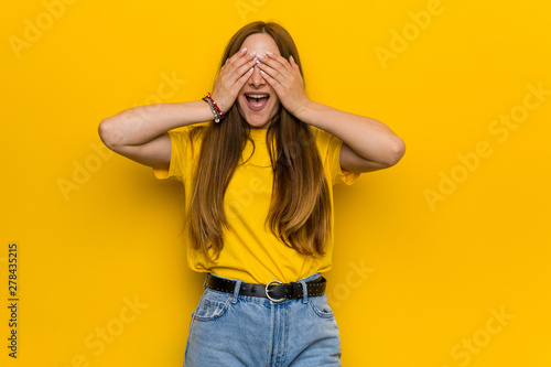 Young ginger redhead woman covers eyes with hands, smiles broadly waiting for a surprise.