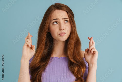 Young ginger woman frowning while holding fingers crossed for god luck