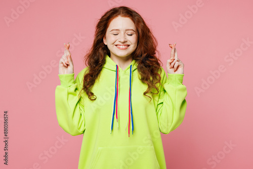 Young ginger woman she wear green hoody casual clothes waiting for special moment, keeping fingers crossed, making wish, eyes closed isolated on plain pastel light pink background. Lifestyle concept.