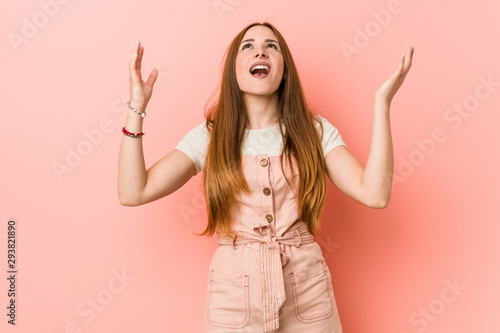Young ginger woman with freckles screaming to the sky, looking up, frustrated.