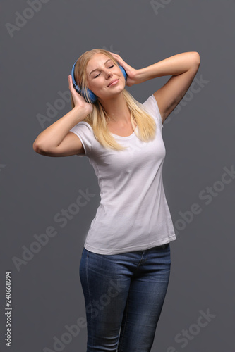 Young girl blonde in blue headphones. Listening, enjoying music. Isolate on a gray background