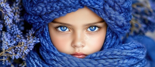 Young girl framed by blue scarf with flowers, piercing blue eyes