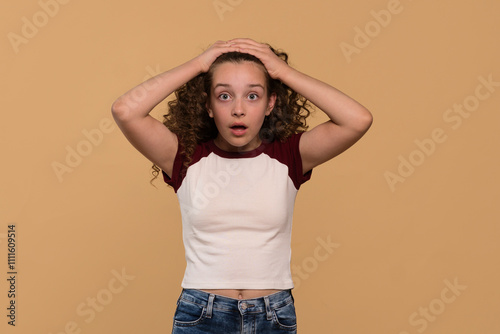 Young girl holding head in shock, expressing disbelief