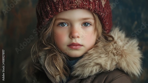 Young girl in a warm winter coat and knitted hat, featuring soft curls and bright blue eyes, exuding a serene and cozy ambiance.