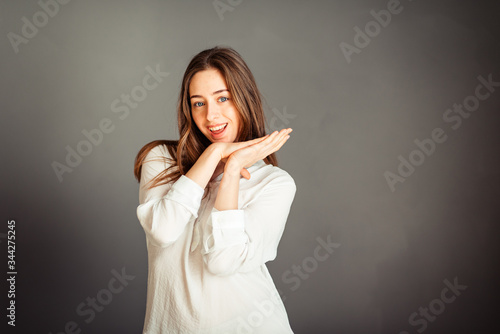 Young girl in a white shirt, hands up, on a gray background. Honest and emotional on the banner, billboard, billboard. No retouch. Without make-up.
