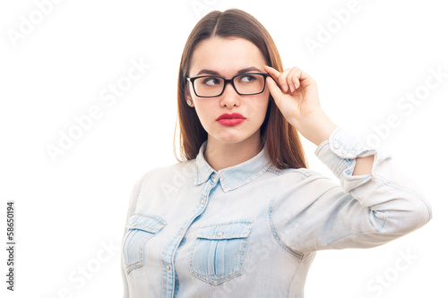 Young girl in glasses on white background
