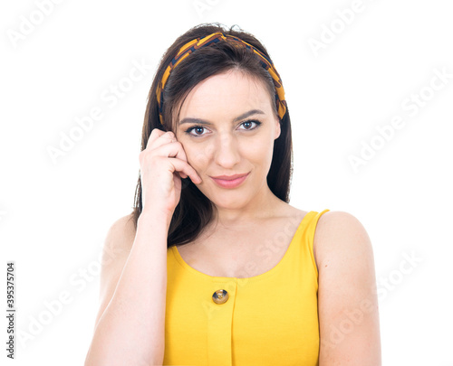 Young girl looking in camera, head and shoulders concept, isolated on white background. Front view. Beautiful attractive woman