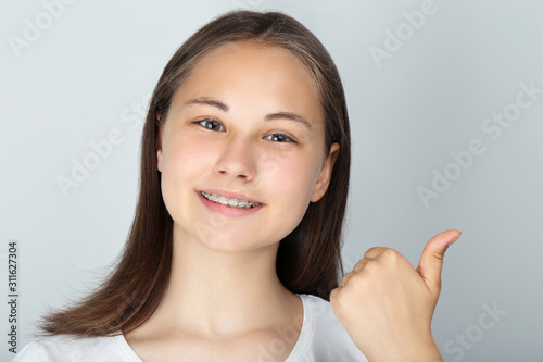 Young girl showing thumb up on grey background