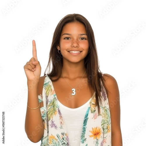 Young girl shows number one with a smile indoors