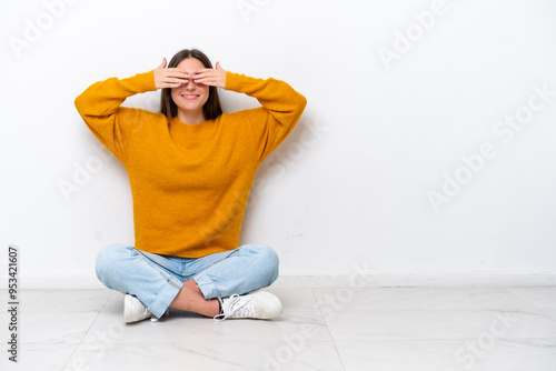 Young girl sitting on the floor isolated on white background covering eyes by hands