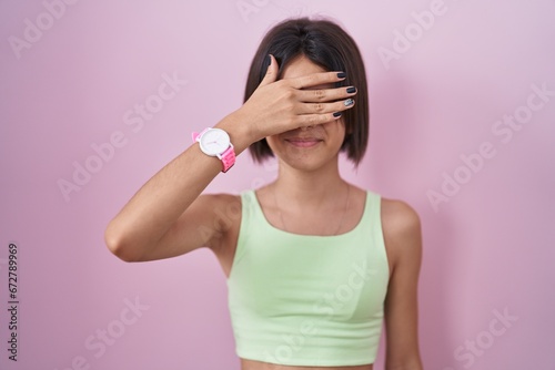 Young girl standing over pink background smiling and laughing with hand on face covering eyes for surprise. blind concept.