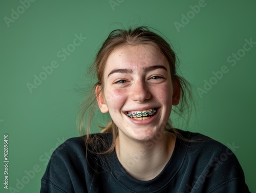 Young girl wearing braces smiling on isolated colored background