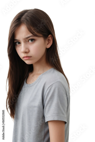 Young girl with angry or dissatisfied feelings standing, isolated, transparent background, no background. PNG.