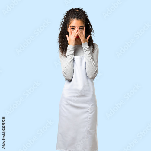Young girl with apron surprised and covering face with hands while looking through fingers on isolated blue background