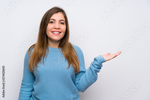 Young girl with blue sweater holding copyspace imaginary on the palm