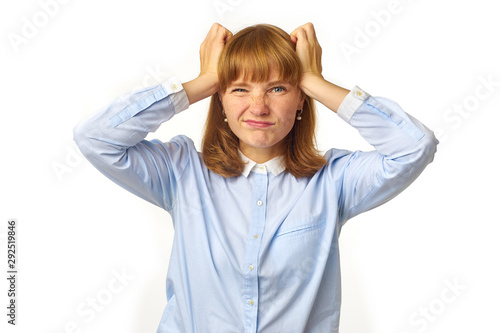 Young girl with ginger hair and freckles touching her head as having a headache our feeling tired, overwhelmed with noises. White background, copy space, isolated model.